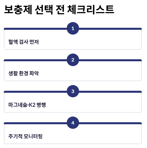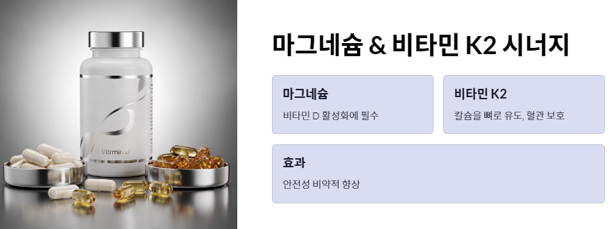 - 마그네슘과 비타민 K2의 시너지: 비타민 D가 활성화되려면 마그네슘이 소모됩니다. 또한 K2는 칼슘이 혈관이 아닌 뼈로 가도록 돕습니다. 이들을 함께 챙기면 비타민d 하루 권장량의 안전성이 비약적으로 높아집니다.
