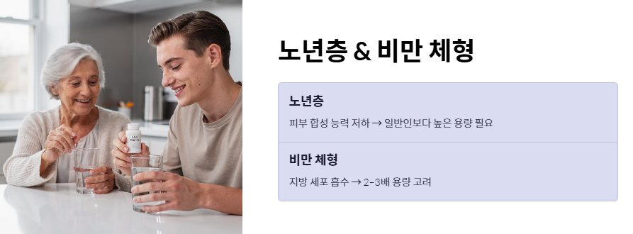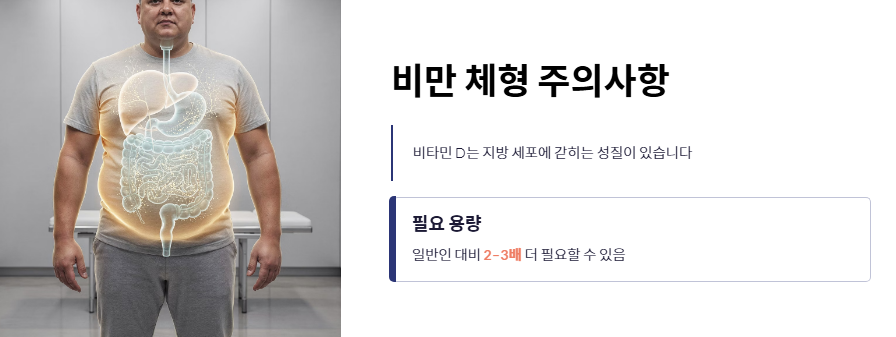 - 비만 체형의 경우: 비타민 D는 지방 세포에 갇히는 성질이 있습니다. 체질량지수가 높을수록 일반인보다 2~3배 많은 비타민d 하루 권장량이 필요할 수 있습니다.