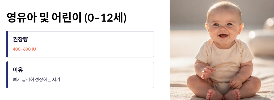 - 영유아 및 어린이(0~12세): 뼈가 급격히 성장하는 시기로, 최소 400~600IU 정도가 하루 권장량으로 권고됩니다.