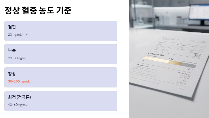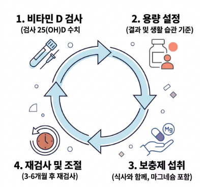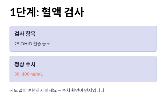 가장 먼저 가까운 병원에서 '25(OH)D' 혈중 농도 검사를 받으세요. 자신의 현재 수치를 모른 채 비타민d 하루 권장량을 정하는 것은 지도 없이 여행을 떠나는 것과 같습니다. 정상 수치(30~100ng/mL)를 기준으로 부족분을 계산해야 합니다.