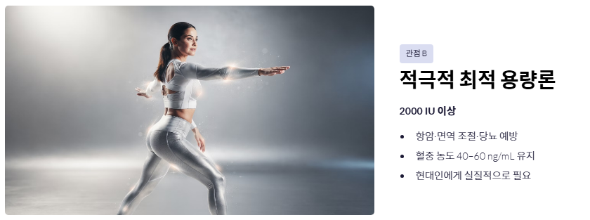 - 관점 B: '적극적 최적 용량(2000IU 이상)' 권장론 단순히 뼈 건강을 넘어 항암, 면역 조절, 당뇨 예방 효과를 보려면 혈중 농도를 40~60ng/mL 이상으로 유지해야 한다는 주장입니다. 이를 위해서는 일반적인 기준보다 높은 비타민d 하루 권장량이 현대인에게 실질적으로 필요하다는 시각입니다.