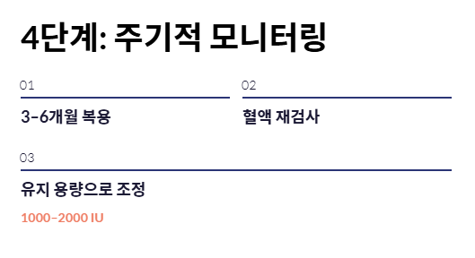 3~6개월 복용 후 다시 혈액 검사를 진행하세요. 수치가 정상 궤도에 올랐다면 고함량에서 유지 용량(약 1000~2000IU)으로 비타민d 하루 권장량을 하향 조정하는 지혜가 필요합니다.