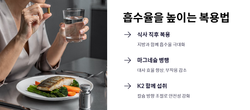 - 지용성 비타민이므로 식사 직후에 복용해야 흡수율을 높일 수 있습니다.