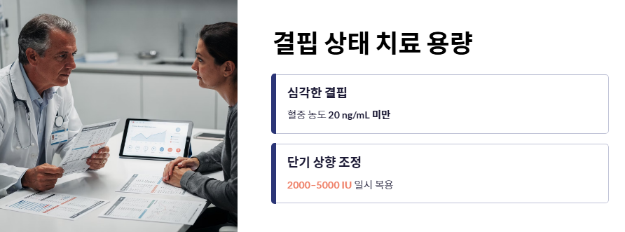- 결핍 상태의 치료 용량: 혈중 농도가 20ng/mL 미만인 심각한 결핍 상태라면, 단기간에 2000~5000IU까지 상향 조정하여 비타민d 하루 권장량을 일시적으로 높여야 할 수도 있습니다.