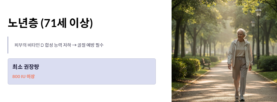 - 노년층(71세 이상): 피부의 비타민 D 합성 능력이 떨어지므로 최소 800IU 이상 섭취하여 골절을 예방하는 것이 필수적인 하루 권장량 수치입니다.