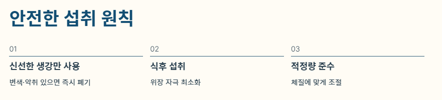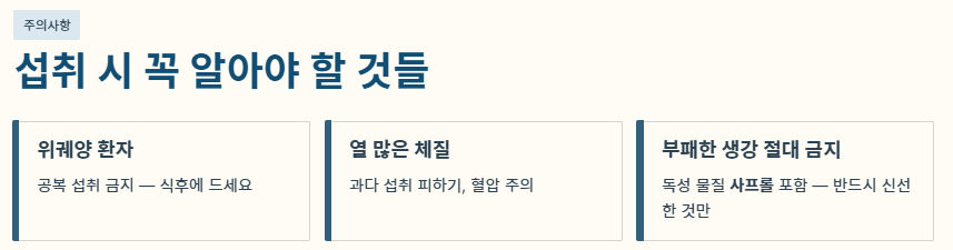 - 부패한 생강 금지: 썩은 생강에는 강력한 독성 물질인 '사프롤'이 포함되어 있어 깎아내고 먹어도 위험합니다. 반드시 신선한 상태에서 생강 효능을 기대하세요.