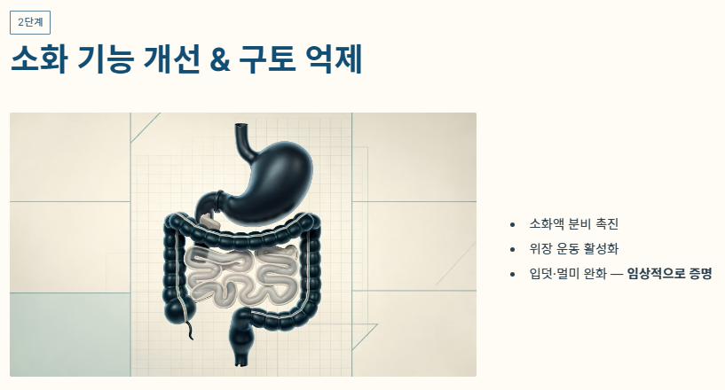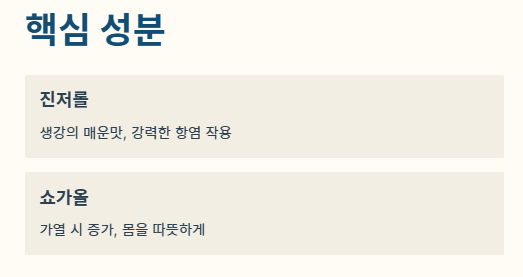 - 2단계: 소화 기능 개선 및 구토 억제 생강은 소화액 분비를 촉진해 위장 운동을 돕습니다. 특히 입덧이나 멀미로 인한 메스꺼움을 진정시키는 것은 임상적으로 증명된 대표적인 생강 효능입니다.