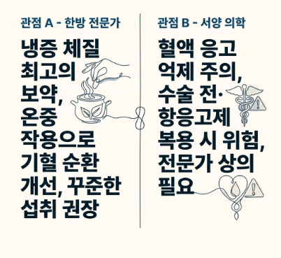 - 관점 B: "체질과 질환에 따라 섭취에 주의가 필요하다" 서양 의학 및 약학 관점에서는 혈액 응고를 늦추는 기능을 주의 깊게 봅니다. 수술을 앞두거나 항응고제를 복용 중인 환자에게는 생강 효능이 오히려 위험할 수 있으므로 섭취량을 조절하거나 전문가와 상의해야 한다는 조언입니다.