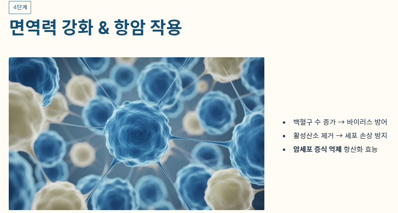 - 4단계: 면역력 강화 및 항암 작용 백혈구 수를 늘리고 외부 바이러스로부터 신체를 보호합니다. 또한 활성산소를 제거해 세포 손상을 막고 암세포의 증식을 억제하는 항산화 효능이 뛰어납니다.