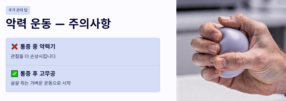 - 악력 운동의 주의: 통증이 있을 때 억지로 악력기를 사용하는 것은 관절을 더 손상시킵니다. 통증이 가라앉은 후 고무공을 살살 쥐는 정도의 가벼운 운동으로 손가락 마디 통증 예방을 시작하세요.