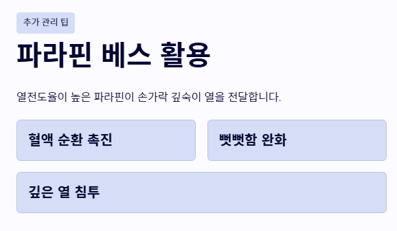 - 파라핀 베스 활용: 열전도율이 높은 파라핀은 손가락 깊숙이 열을 전달하여 혈액 순환을 돕고 뻣뻣해진 손가락 마디 통증 완화에 탁월한 효과가 있습니다.