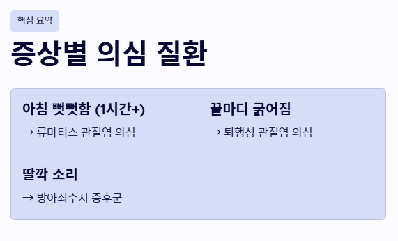 - 아침에 뻣뻣하면 류마티스, 끝마디가 굵어지면 퇴행성 관절염을 의심해야 합니다.