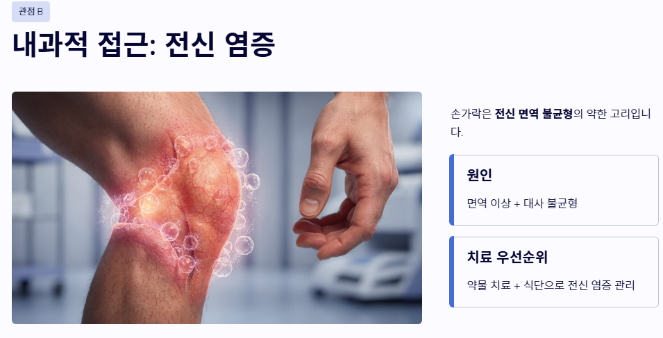 - 관점 B: '염증 및 전신 대사' 중심의 내과적 접근 단순한 사용 문제가 아니라 몸 전체의 면역 불균형이나 대사 이상이 손가락이라는 약한 고리로 나타난다고 봅니다. 손가락 마디 통증을 해결하기 위해 약물 치료와 식단 조절을 통한 전신 염증 수치 관리가 필수적이라는 시각입니다.
