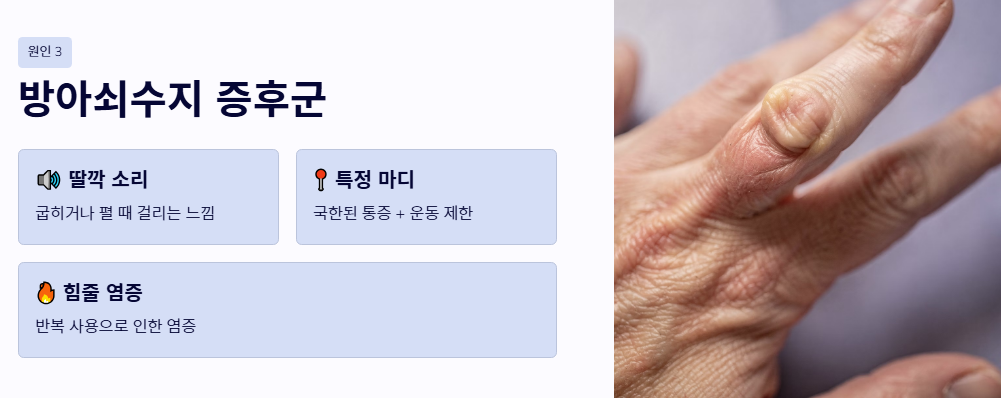 - 딸깍 소리가 나는 손가락 마디 통증은 방아쇠수지 증후군일 가능성이 큽니다.