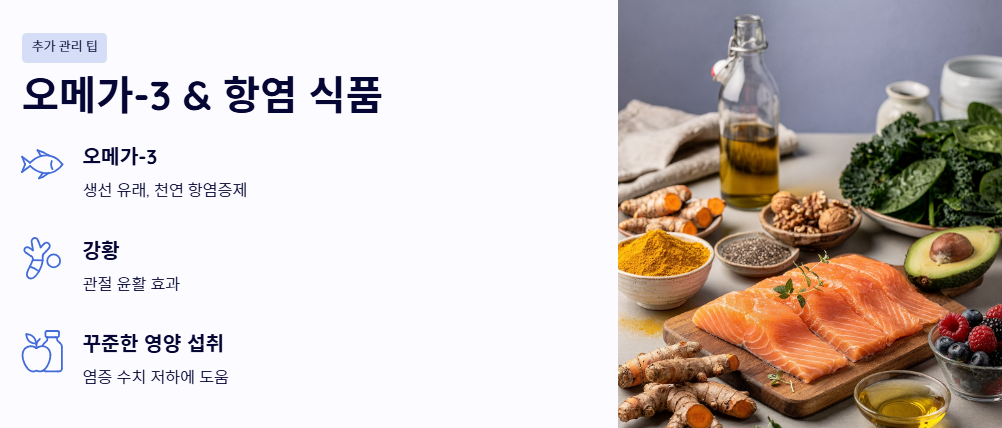 - 오메가-3와 항염 식품 섭취: 생선 유래 오메가-3나 강황 등은 천연 항염증제 역할을 합니다. 꾸준한 영양 섭취는 관절의 윤활유 역할을 하여 손가락 마디 통증 수치를 낮추는 데 도움을 줍니다.