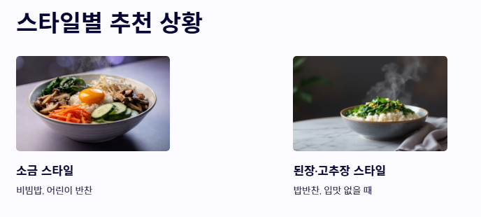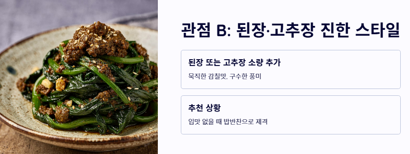 - 관점 B: '된장이나 고추장'을 가미한 진한 스타일 구수한 된장이나 매콤한 고추장을 살짝 섞어 무쳐냅니다. 입맛이 없을 때 밥반찬으로 제격이며, 묵직한 감칠맛을 즐기는 분들에게 추천하는 시금치나물 맛있게 무치는법입니다.