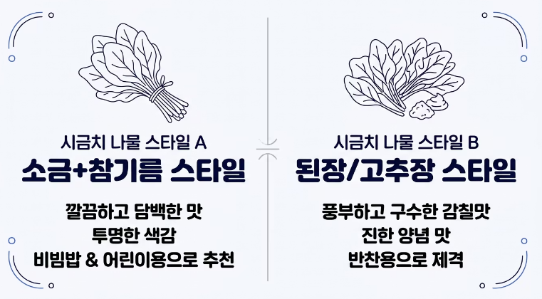 요리의 스타일과 취향에 따라 시금치나물 맛있게 무치는법은 크게 두 가지 시각으로 나뉩니다.