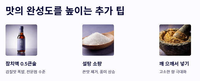 - 참기름과 으깬 깨로 고소한 풍미를 입혀 마무리합니다.