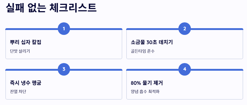 - 뿌리 살리기: 시금치의 가장 단 부분은 붉은빛이 도는 뿌리 쪽입니다. 뿌리를 완전히 잘라내지 말고 겉껍질만 살짝 긁어낸 뒤 십자로 칼집을 내어 가르는 것이 진정한 시금치나물 맛있게 무치는법의 고수입니다.