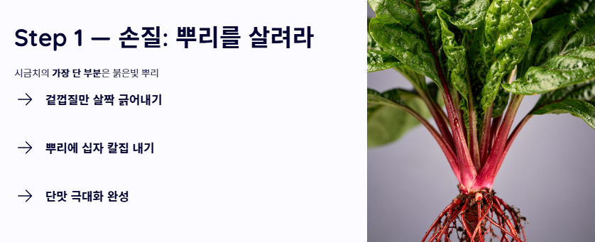 - 시금치 뿌리의 붉은 부분을 살려 손질해야 본연의 단맛을 즐길 수 있습니다.