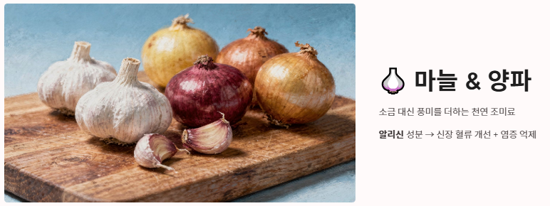 - 마늘과 양파: 나트륨을 대신해 풍미를 더해주며, 알리신 성분이 신장의 혈류를 개선하고 염증을 억제합니다.