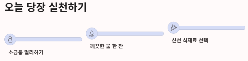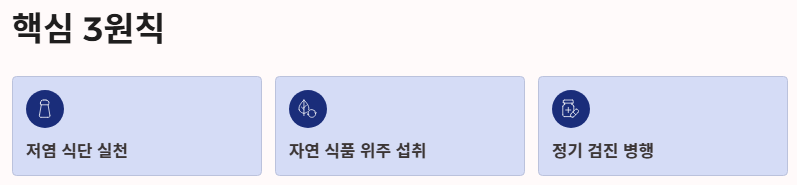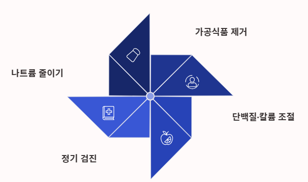- 핵심 원칙: 저염 식단을 실천하고, 가공되지 않은 자연 식품 위주로 섭취하며, 정기적인 검진을 병행할 것.