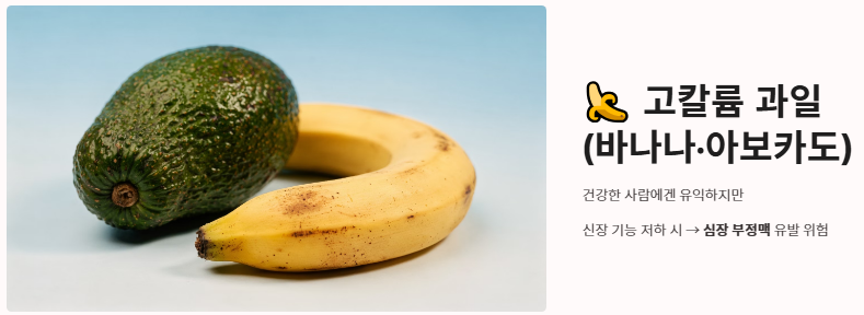 - 고칼륨 과일(바나나, 아보카도): 건강한 사람에겐 좋지만, 신장 기능이 저하된 이들에게 과도한 칼륨은 심장 부정맥을 유발할 수 있어 주의가 필요합니다.