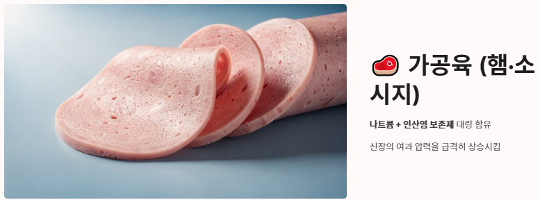 - 가공육(햄, 소시지): 나트륨과 인산염 보존제가 대량 함유되어 있어 신장의 여과 압력을 급격히 높입니다.