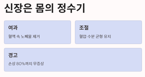 "침묵의 살인자 신장, 당신의 몸이 보내는 마지막 구조 신호를 읽고 계신가요?"우리 몸의 정수기라고 불리는 신장은 기능의 70~80%가 손상될 때까지 특별한 통증을 유발하지 않습니다. 그래서 많
