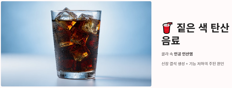 - 짙은 색의 탄산음료: 콜라 등에 들어있는 인공 인산염은 신장에 결석을 만들거나 기능을 떨어뜨리는 주된 원인이 됩니다.