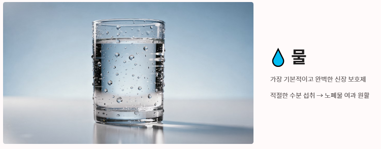 - 물: 가장 기본적이면서도 완벽한 신장에 좋은 음식 나쁜 음식의 주인공입니다. 적절한 수분 섭취는 신장이 노폐물을 걸러내는 과정을 원활하게 돕습니다.