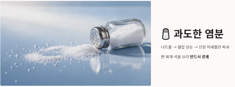 - 과도한 염분(소금): 나트륨은 혈압을 높여 신장의 미세혈관을 파괴합니다. 맵고 짠 한국식 찌개와 국물 요리는 신장에 좋은 음식 나쁜 음식 리스트에서 반드시 경계해야 할 대상입니다.