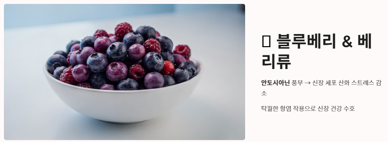 - 블루베리와 베리류: 안토시아닌이 풍부해 신장 세포의 산화 스트레스를 줄여줍니다. 항염 작용이 탁월하여 신장 건강을 지키는 데 매우 효과적입니다.