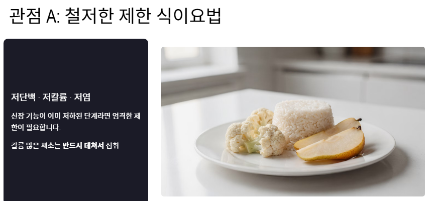 - 관점 A: "저단백·저칼륨·저염 식단이 생명이다" 신장 기능이 이미 저하된 단계라면 철저한 제한 식이요법이 필요하다는 관점입니다. 이들은 신장에 좋은 음식이라 할지라도 칼륨이 많은 과일이나 채소는 반드시 데쳐 먹는 등 조리법까지 엄격하게 제한해야 한다고 강조합니다.
