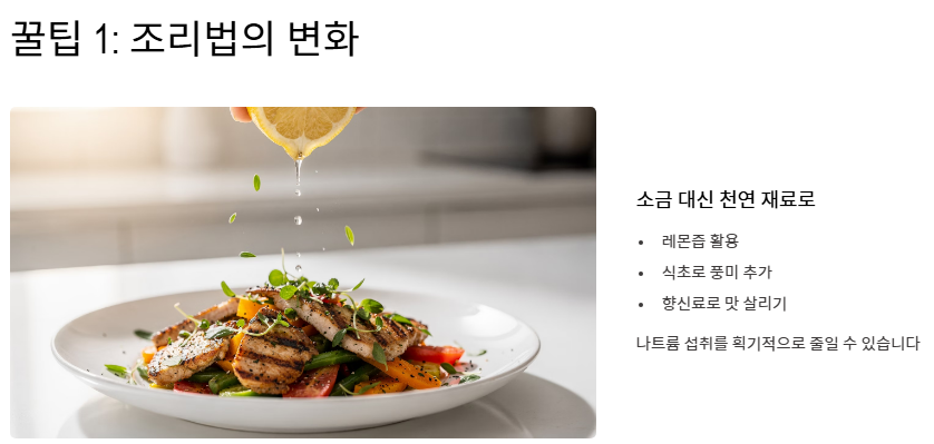 - 조리법의 변화: 소금 대신 레몬즙, 식초, 향신료를 사용하여 맛을 내면 나트륨 섭취를 획기적으로 줄이면서 신장에 좋은 음식의 풍미를 살릴 수 있습니다.