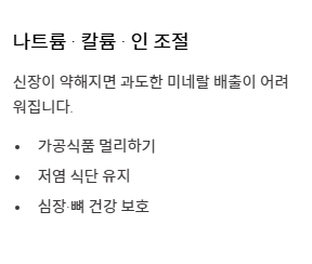 - 충분한 휴식과 저염 습관은 신장 건강을 유지하는 기본 중의 기본입니다.