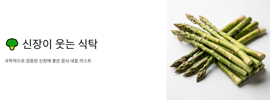 - 아스파라거스: 천연 이뇨제 역할을 하여 소변 배출을 돕고 신장 내 결석 예방에 효과적인 신장에 좋은 음식입니다.