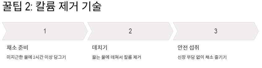- 칼륨 제거 기술: 칼륨 섭취를 줄여야 한다면 채소를 미지근한 물에 2시간 이상 담가두거나 끓는 물에 데쳐서 드세요. 이는 신장에 좋은 음식을 더 안전하게 섭취하는 요령입니다.