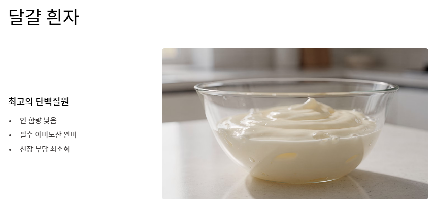 - 달걀 흰자: 인 함량이 낮으면서도 필수 아미노산을 모두 갖춘 양질의 단백질원으로, 신장 부담을 최소화하는 신장에 좋은 음식입니다.