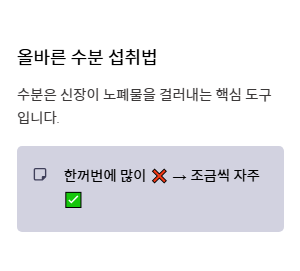 수분은 신장이 노폐물을 걸러내는 데 필요한 핵심 도구입니다. 하지만 한꺼번에 너무 많은 물을 마시기보다는 조금씩 자주 마셔 신장에 과부하가 걸리지 않도록 돕는 것이 진정한 의미의 신장에 좋은 음식 활용법입니다.