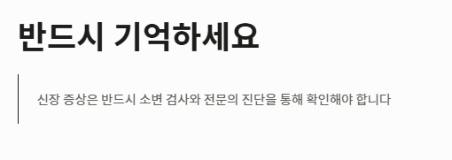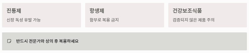 - 주의점: 자가 진단으로 약물을 오남용하면 신장이 안좋으면 나타나는 증상이 돌이킬 수 없게 됩니다.