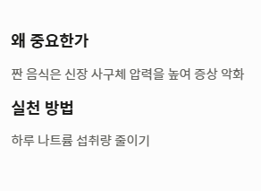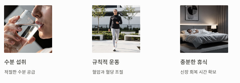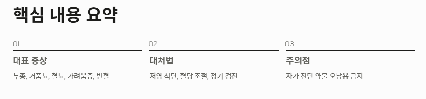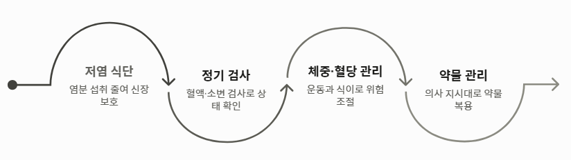 - 대처법: 저염 식단, 혈당 조절, 정기 검진을 통해 신장이 안좋으면 나타나는 증상의 악화를 막아야 합니다.