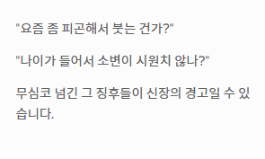 - 피부 가려움증: 노폐물이 배출되지 못하고 혈액 속에 쌓이면 피부가 건조해지고 가려워지는데, 이 역시 신장이 안좋으면 나타나는 증상입니다.