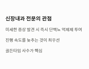 - 조기 진단 및 약물 개입 관점: 신장내과 전문의들은 신장이 안좋으면 나타나는 증상이 미세하게라도 나타났을 때 즉시 단백뇨 억제제 등을 투여하여 진행 속도를 늦춰야 한다고 봅니다. 이 관점에서는 신장이 안좋으면 나타나는 증상의 골든타임을 사수하는 것을 최우선으로 합니다.
