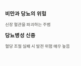 비만과 당뇨는 신장 혈관을 파괴하는 주범입니다. 혈당이 조절되지 않으면 신장이 안좋으면 나타나는 증상인 당뇨병성 신증으로 발전할 위험이 매우 높습니다.