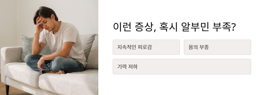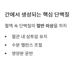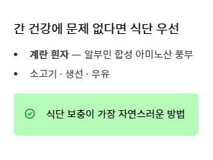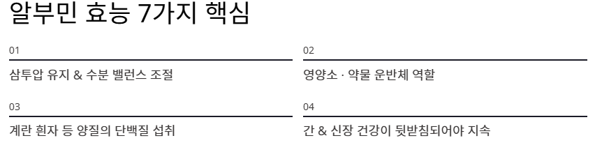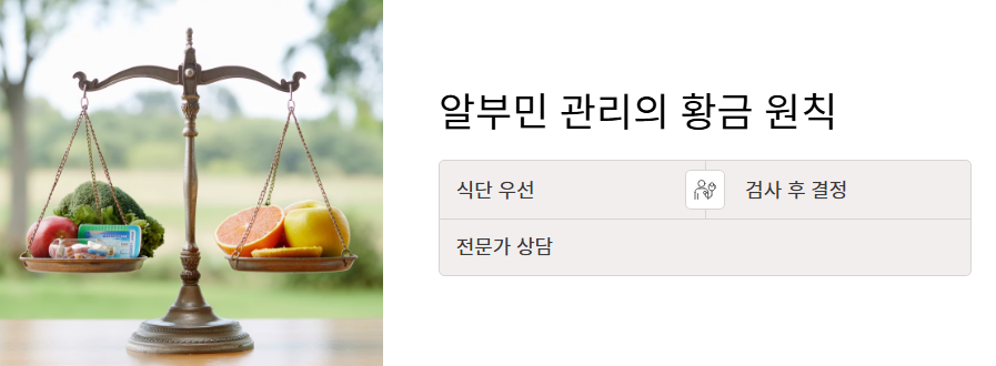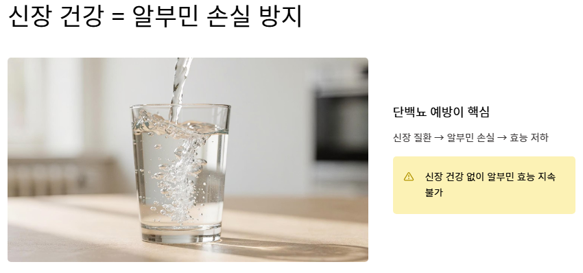 - 간과 신장 건강이 뒷받침되어야 알부민의 효능이 지속될 수 있습니다.