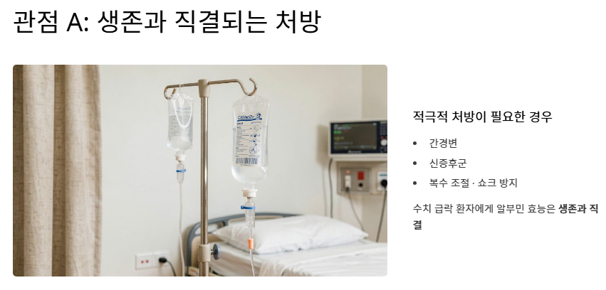 - 관점 A: "심각한 결핍 환자에게는 생명줄과 같은 필수 처방이다" 간경변이나 신증후군 등으로 수치가 급락한 환자들에게 알부민의 효능은 생존과 직결됩니다. 복수를 조절하고 쇼크를 방지하기 위해 적극적인 수액 처방을 통해 알부민의 효능을 끌어올려야 한다는 입장입니다.
