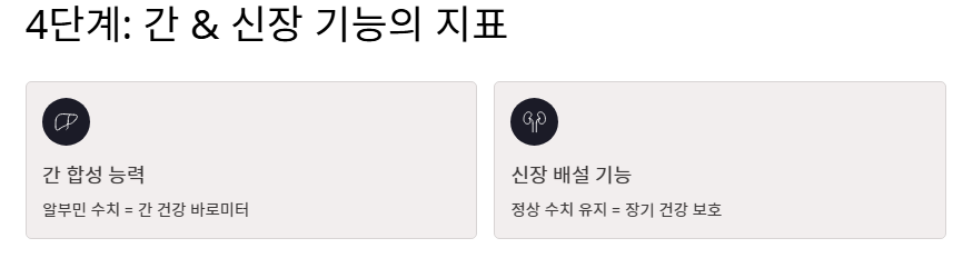 - 4단계: 간 및 신장 기능의 지표: 체내 알부민 수치는 간의 합성 능력과 신장의 배설 기능을 나타냅니다. 정상 수치를 유지함으로써 장기 건강을 지키는 것이 궁극적인 알부민의 효능이라 할 수 있습니다.