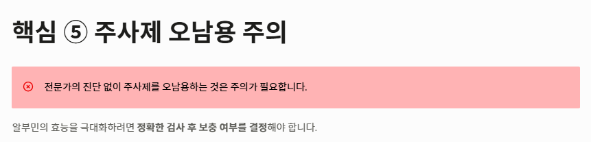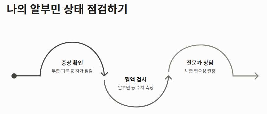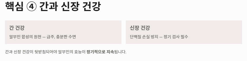 - 간과 신장 건강이 뒷받침되어야 알부민의 효능이 장기적으로 지속됩니다.