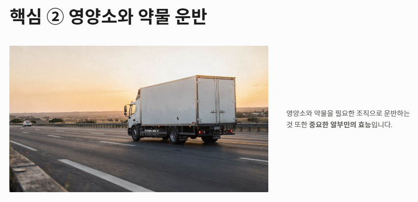 - 영양소와 약물을 필요한 조직으로 운반하는 것 또한 중요한 알부민의 효능입니다.